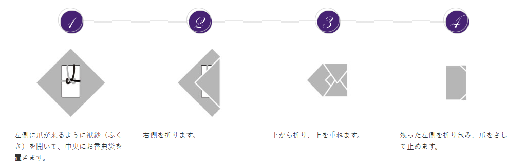 不祝儀袋の表書きは宗教によって書き方が異なるので注意が必要です。また、裏側の重ね方は下を折ってから上を折り重ねます。お札は裏面(人物のない方の面)が表書きと同じ向きになるように入れます。