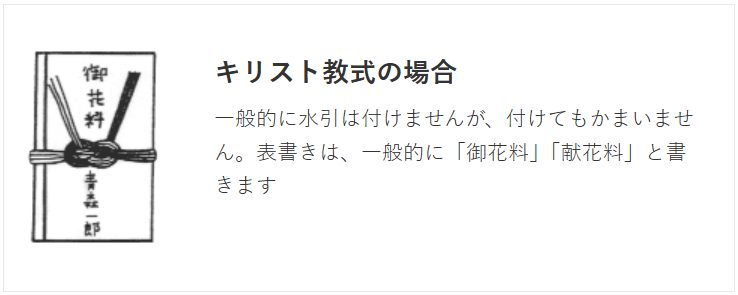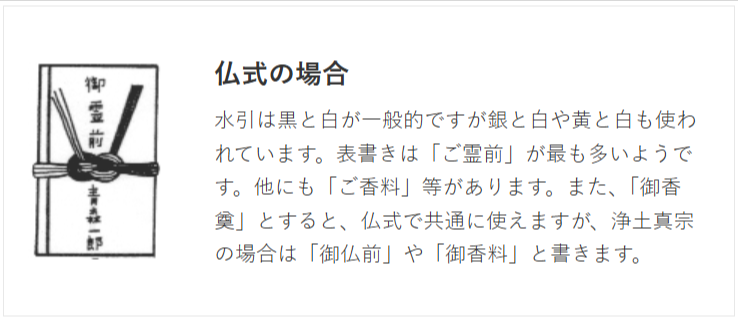 一般的には、水引きの付いた市販の不祝儀袋を使い、涙でにじんでしまったという意味がある薄墨で表書きをします。毛筆で楷書で書くのが正式ですが、筆ペンで書いてもよいでしょう。